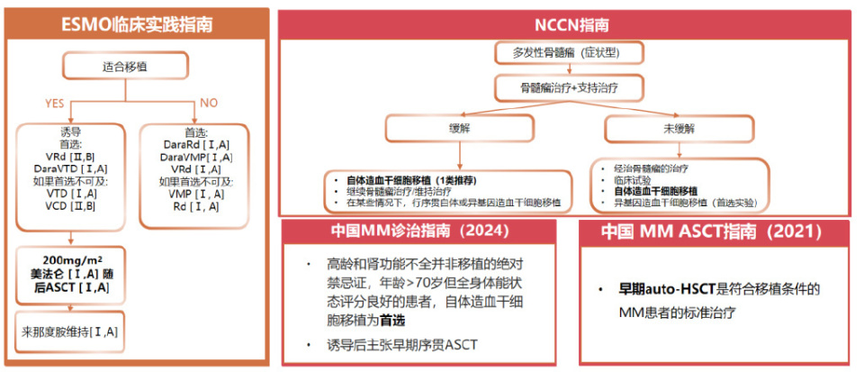 北欧一项纳入上千例患者的回顾性研究表明,接受自体移植的患者生存优于未接受移植者。基于现有的数据库和临床研究,自体造血干细胞移植被公认为适合移植患者的首选治疗方案。目前,包括欧洲肿瘤内科学会(ESMO)临床实践指南、美国国立综合癌症网络(NCCN)指南以及中国的相关指南均推荐,对于适合移植的患者,在诱导治疗后应将自体造血干细胞移植作为标准治疗方案。