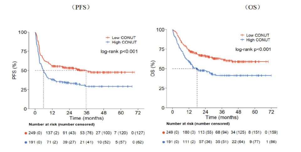 中位随访时间31.00个月(0.13-72.00个月),整体中位无进展生存期(PFS)为10.55个月,中位总生存期(OS)未达到,5年PFS率和OS率分别为39.7%和51.3%。CAR-T治疗后,低CONUT组的最佳缓解率明显高于高CONUT组(67.5% vs. 57.4%),(P=0.0360)。低CONUT组5年PFS率为47.54%(95%CI: 40.46-54.27),明显高于高CONUT组29.33%(95%CI: 22.26-36.74)(P<0.0001);低CONUT组5年OS率为58.98%(95%CI: 51.44,65.75),也明显高于高CONUT组41.30%(95%CI: 33.58,48.83)(P<0.0001)。采用Log-rank检验两组的PFS和OS的生存曲线,结果显示低CONUT组的中位PFS(P<0.001)和中位OS(P<0.001)均优于高CONUT组,差异具有统计学意义(下图)。
