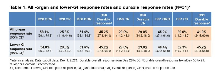 该研究共纳入31例患者(高剂量组:n=15;低剂量组:n=15;固定剂量组:n=1);基线和疾病特征均衡良好。27例(87.1%)患者患有III-IV级aGVHD,20例(64.5%)患者患有3-4级下消化道aGVHD。Apraglutide耐受性良好;大多数不良事件为非严重事件,且被评估为与治疗无关,包括11例出现致命事件的患者。在第28、56和91天,所有器官的OR率分别为58.1%、51.6%和45.2%,CR率分别为25.8%、29.0%和29.0%(表1)。下消化道的OR率分别为54.8%、51.6%和48.4%,CR率分别为29.0%、29.0%和32.3%。从第28天到56天,所有器官和下消化道持续OR率均为45.2%。从第56天到91天,所有器官的持续OR率为41.9%,下消化道的持续OR率为45.2%。