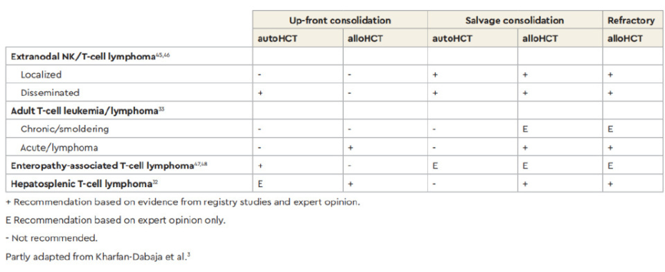 罕见PTCL亚型的HCT应用:尽管针对三大PTCL亚型(PTCL-NOS、AITL、ALK-ALCL)的HCT经验部分适用于罕见亚型,但后者生物学特征、临床病程及管理策略差异显著,影响移植时机与作用。例如,肝脾T细胞淋巴瘤(HSTL)及高危成人T细胞白血病/淋巴瘤(ATLL)虽呈侵袭性病程且早期化疗耐药,但可受益于一线alloHCT;而早期结外NK/T细胞淋巴瘤预后良好,无需一线HCT巩固。多数罕见PTCL亚型的HCT证据有限,相关推荐多基于专家共识。