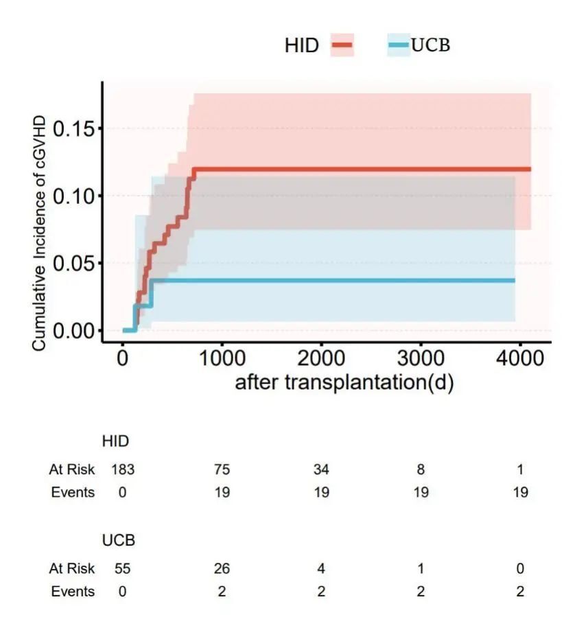1000天cGVHD累积发生率方面,HID 11.96%(0.75%-17.6%)vs. URCB 0.04%(0.006-11.4%),P=0.118(图5)。