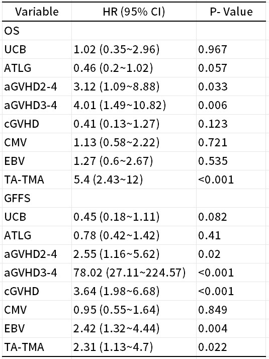 供者类型/ATG类型、aGVHD/cGVHD、CMV/EBV、ATG/TA-TMA等多因素分析显示,aGVHD及TA-TMA是影响OS及GFFS的高危因素,EBV感染不增加OS风险,但显著增加GFFS风险。