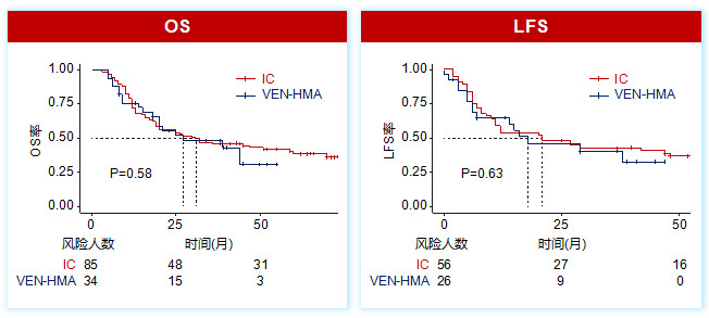 图1. 维奈克拉联合去甲基化药物能改善患者的总生存(OS)和无白血病生存(LFS)