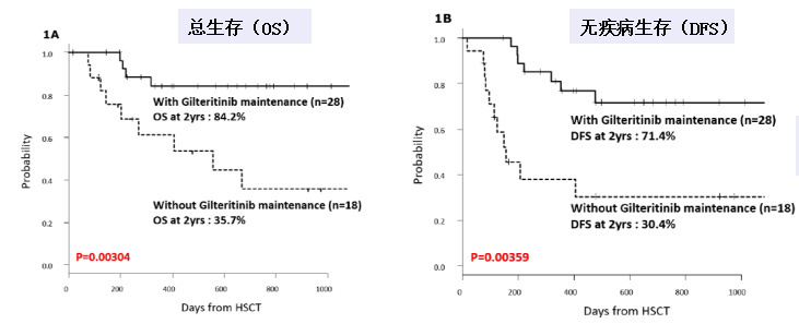 图4. 吉瑞替尼作为FLT3-ITD突变AML患者移植后维持治疗,能改善生存结局