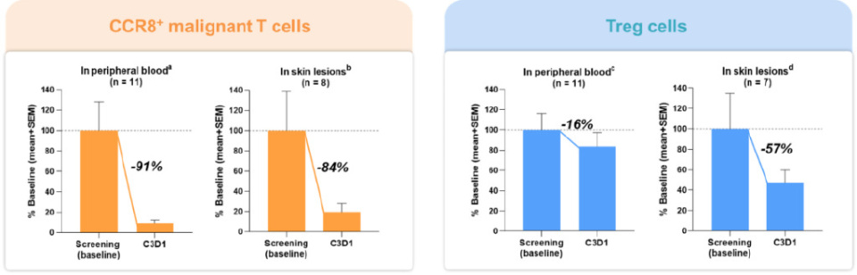 CCR8+生物标志物探索:基线CCR8高表达组(≥10%)的5例患者中,有4例(80%)皮肤疗效评估达到PR,而低表达的患者中,亦有1例获得皮肤PR,提示CCR8高表达可能为疗效预测标志物。