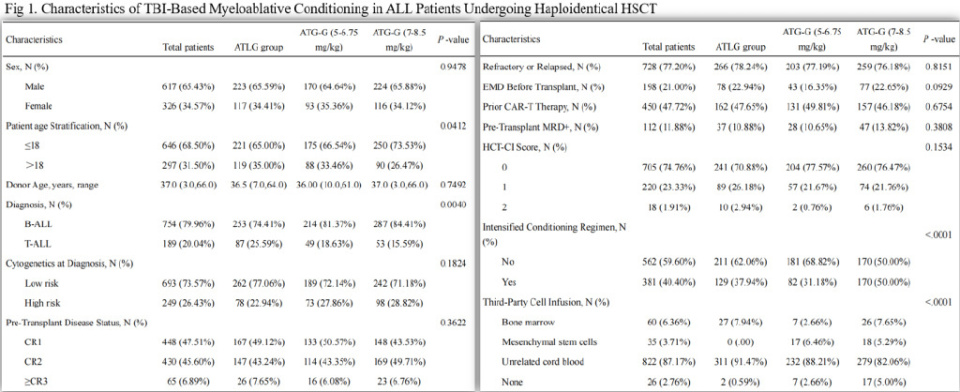 对2018年1月至2022年12月期间在河北燕达陆道培医院和北京陆道培医院接受首次HID-HSCT,943例完全缓解(CR)ALL患者进行了回顾性分析。所有患者均接受ATG-T或ATLG作为基于TBI的GVHD预防MAC方案的一部分。根据ATG给药情况将患者分为三组:ATLG(20 mg/kg,分4天;n=340),ATG-T(5-6.75 mg/kg,分4天;n=263)和ATG-T(7-8.5 mg/kg,分4天;n=340)。随访日期截止到2024年12月30日。