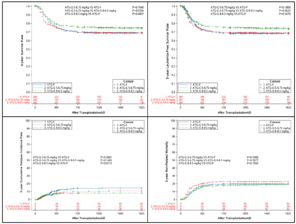 随访时间截至2024年12月30日,中位随访时间为52个月(范围:27-83个月)。ATLG组5年总生存率(OS)与ATG-T组(5-6.75 mg/kg)[HR 1.238 (95%CI:0.917-1.671),P=0.164]、ATG-T组(7-8.5mg/kg) [HR 0.895 (95%CI:0.667-1.210),P=0.460]、5年无白血病生存率(LFS)与ATG-T组(5-6.75 mg/kg)[HR 1.222 (95%CI:0.907-1.645),P=0.186]、ATG-T组(7-8.5 mg/kg) [HR 0.914(95%CI:0.683-1.224),P=0.547]比较无显著差异。ATLG组5年累积复发率(CIR)与ATG-T组(5-6.75 mg/kg)相似[HR 0.791(95%CI:0.473-1.320),P=0.369],但显著高于ATG-T组(7-8.5 mg/kg)[HR 0.581(95%CI:0.311-0.861),P=0.011]。ATG-T(5-6.75 mg/kg)组5年非复发死亡率(NRM)显著高于ATLG组[HR 1.482(95%CI:1.025-2.143),P=0.036]。ATG-T(7-8.5 mg/kg)组5年LFS、CIR、NRM与ATG-T(5-6.75 mg/kg)组相当,但5年OS高于ATG-T(95%CI:1.015-2.053) [HR 1.372 (95%CI:1.015-2.053),P=0.0394]。见图3。