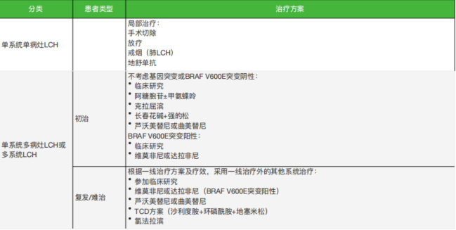 LCH的治疗需根据疾病分型、器官受累程度及基因突变状态制定个体化方案。对于单系统单病灶型,以病变刮除、手术、放疗等局部治疗为主。患有孤立性肺LCH的成年吸烟患者需要严格戒烟。研究显示,中位随诊38m,单系统单病灶的3年无事件生存期(EFS)为63%;3年总生存率(OS)为97%。
