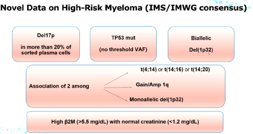 Second, from the bone marrow perspective, FISH analysis should include not only the previously recommended t(4;14), t(14;16), and t(14;20) translocations, but also additional high-risk cytogenetic abnormalities:1q gain or amplification,1p32 deletion, whether monoallelic or biallelic,and TP53 mutations.