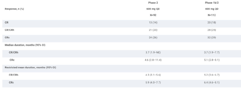 方法:KOMET-001(NCT04067336)是一项多中心、开放标签的Ⅰ期/Ⅱ期研究,评估Ziftomenib在成人R/R AML患者中的疗效。在Ⅱ期中,NPM1突变的R/R AML患者接受Ziftomenib 600 mg 每日一次治疗。Ⅱ期的主要终点为完全缓解伴完全/部分血液学恢复(CR/CRh);关键次要终点为复合完全缓解(CRc)、CR/CRh和CRc的持续时间以及安全性。以下分析包括来自Ⅰb/Ⅱ期的NPM1突变患者数据。