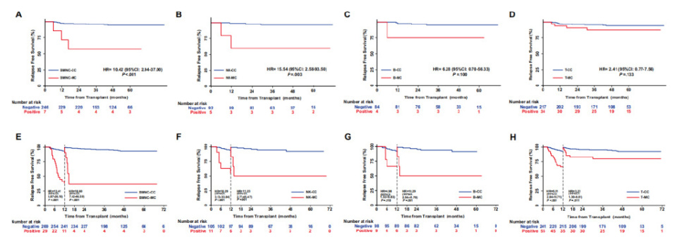 在356名患者中,按计划时间点采集骨髓单核细胞(BMNCs)、NK细胞、T细胞及B细胞。共有45例(12.64%)至少出现一次BMNC-MC,首次发生的中位时间为6个月。移植前NR状态及pMRD均与BMNC-MC相关。BMNC-MC组患者的2年OS显著低于BMNC-CC组(46.47% vs. 88.34%;P<0.001),RFS亦明显降低(75.86% vs. 90.81%;P<0.001),复发率显著升高(86.21% vs. 8.96%;P<0.001)。