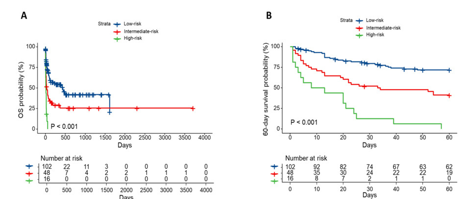 进一步分析发现,升高的B2M、增加的肌酐、粒细胞减少症、严重血小板减少、低纤维蛋白原水平和高Epstein-Barr病毒DNA拷贝数是风险因素,将其进一步整合建立预后模型,可分为低、中、高风险三组。低风险组的中位生存期为428天,中风险组为102天,高风险组为18天,三组的6个月生存率存在显著差异(67%、46%和14%)。