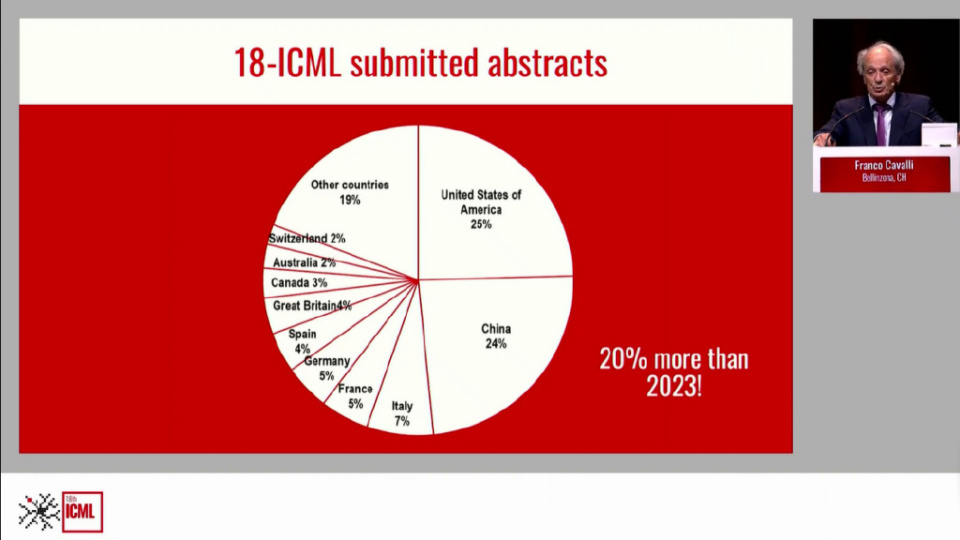 Franco Cavalli教授首先向与会者致以热烈欢迎,并提及尽管当前地缘政治局势复杂,但会议始终致力于为学界搭建开放包容的交流平台。他透露,本届会议收到的摘要数量较去年激增20%,其中美国提交的摘要占比25%,中国以24%紧随其后,德国、法国各占5%,英国与西班牙各4%,加拿大3%,瑞士及澳大利亚各2%,充分彰显了全球学术力量的积极参与。