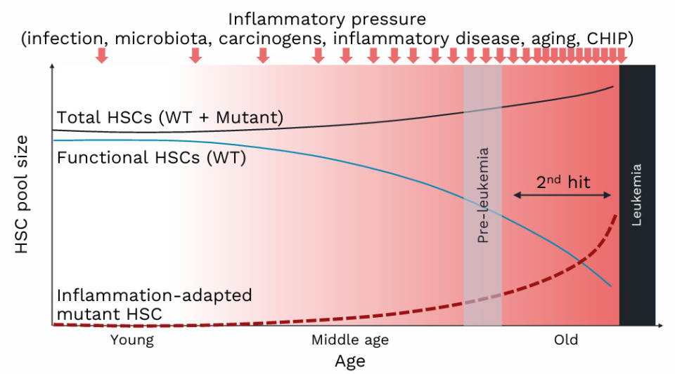 持续的炎症信号暴露,如感染和微生物代谢物,会导致造血干细胞衰竭、分化偏差和再生潜力的降低[1-2]。随着时间的推移,这种炎症应急环境促进了突变的积累、多样性的丧失以及突变克隆的扩展——这些是不确定潜力的克隆性造血和与年龄相关的克隆性造血的标志。像Tet2和Dnmt3a等基因突变在这一背景下尤为常见[3-5]。此外,炎症不仅有利于这些突变克隆的生长,还增加了恶性转化的风险,尤其是在伴随二次打击的情况下。