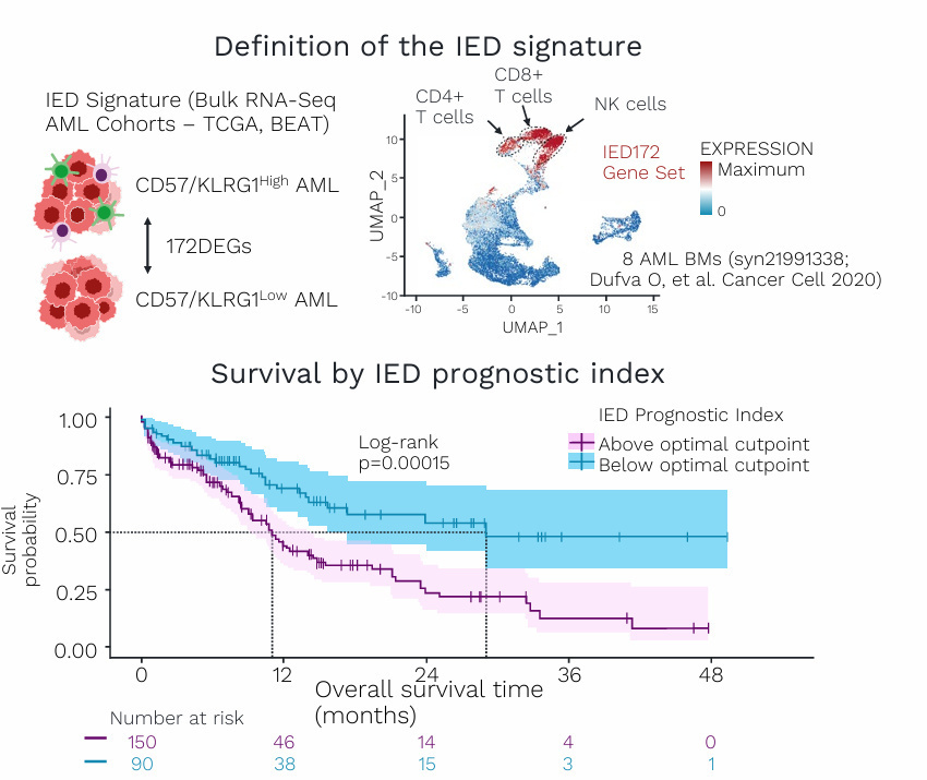 技术进步使我们能够更深入地表征急性髓系白血病 (AML) 中的肿瘤微环境 (TME),从而揭示导致疾病进展的机制。先前的研究发现,自然杀伤(NK)样衰老CD8+ T细胞是免疫应答不佳的标志。基于这些发现,在今年的EHA大会上,一项报告介绍了一种免疫效应功能障碍(IED)预后指数,该指数根据基因表达将AML细胞分为衰老/NK高和衰老/NK低两组[9]。IED特征主要由T细胞和NK细胞在TME中表达。在BEAT-AML2的真实世界队列中,高IED评分与接受强化化疗治疗的患者预后不良相关。当与AML干性标志物(如LSC17)结合时,IED指数有助于区分具有良好(IED低/干性低)和较差预后的亚组[10]。