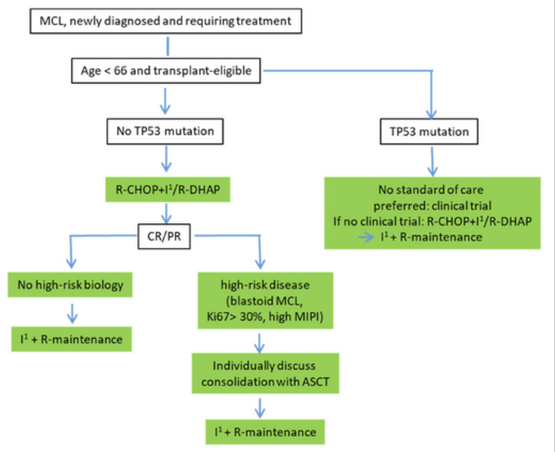 综上所述,VR-CAP、BR或R-CHOP代表了当前不适合大剂量治疗(占套细胞淋巴瘤患者多数)老年患者的标准方案。我们认为,对于较高风险特征(如高Ki67表达、母细胞样形态)的患者,应优先选择VR-CAP。BR则可能特别适用于表现更像慢性淋巴细胞白血病(CLL)的惰性型患者。