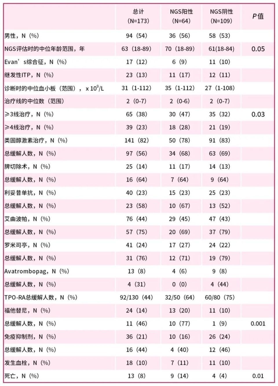 82%的患者接受了治疗(中位为2线治疗,1~7),主要是类固醇激素(100%)、血小板生成素受体激动剂(TPO-RA)(75%)、利妥昔单抗(23%)、细胞毒性免疫抑制剂(21%)和福他替尼(Fostamatinib)(14%,见下表);NGS阳性的患者复发/难治的比例更高(>3线)为47%,NGS阴性患者为32%(P=0.03);在少数患者中,NGS阳性的患者使用福他替尼的有效率为77%(10/13),而NGS阴性患者有效率为9%(1/11)(P=0.001)。整个研究人群中,18例患者(10%)在病程中出现与NGS突变无关的血栓并发症。无患者疾病进展至髓系肿瘤。在5年的中位随访期间(NGS阳性/阴性病例相似),13例患者死亡,NGS阳性组更多见(14%),NGS阴性组为4%(P=0.01)。患者死亡原因与ITP无关。