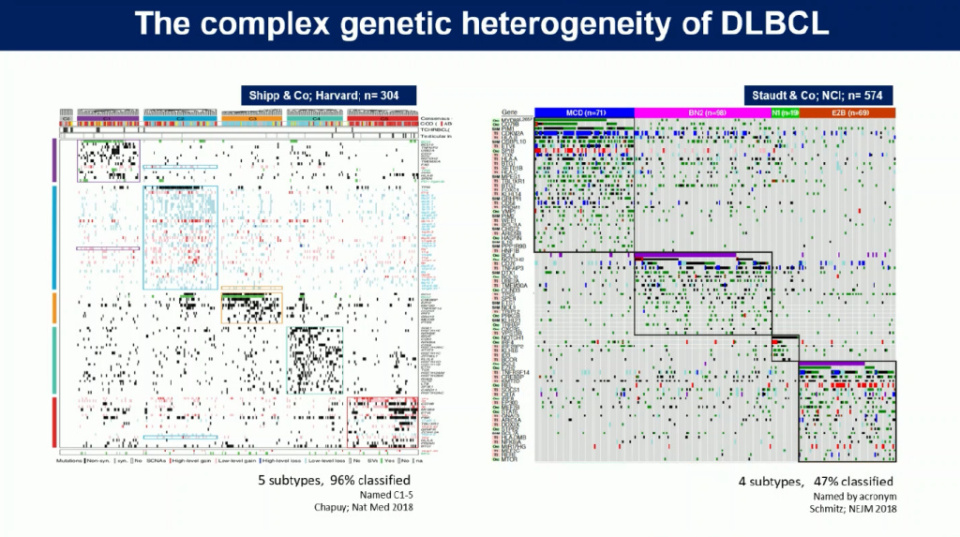 Hartson教授指出,DLBCL在基因层面并非单一疾病,而是由多种疾病构成的复杂综合体。通过回顾多项里程碑式的外显子组测序研究,他强调了DLBCL基因谱的高度复杂性与异质性。“我们讨论的不仅仅是单个基因突变,DLBCL中约有150个反复突变的基因,超过1000种反复出现的具体突变位点,并且每个患者体内通常携带5至15个驱动突变的组合。” 这种“千人千面”的基因特征意味着几乎每位患者的肿瘤都是独一无二的,这给理解突变功能及制定有效治疗策略带来了巨大挑战。