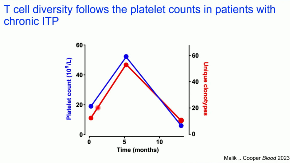 这些扩增的T细胞克隆与疾病的活动性密切相关:当患者血小板计数下降时,这些克隆急剧扩张;而当病情改善时,其数量则相应减少。 基因表达谱分析进一步揭示,这些扩增的克隆具有典型的细胞毒性特征,并处于TCR信号被激活的状态,表明它们正在主动攻击靶细胞,直接参与了ITP的病理过程。 这一系列发现为ITP,尤其是难治性ITP,提供了全新的病理学解释,即它可能是一种T细胞驱动的疾病。有趣的是,研究还初步发现TPO-RA药物艾曲波帕(Eltrombopag)可能通过其铁螯合作用,发挥免疫调节功能,抑制T细胞的过度增殖。