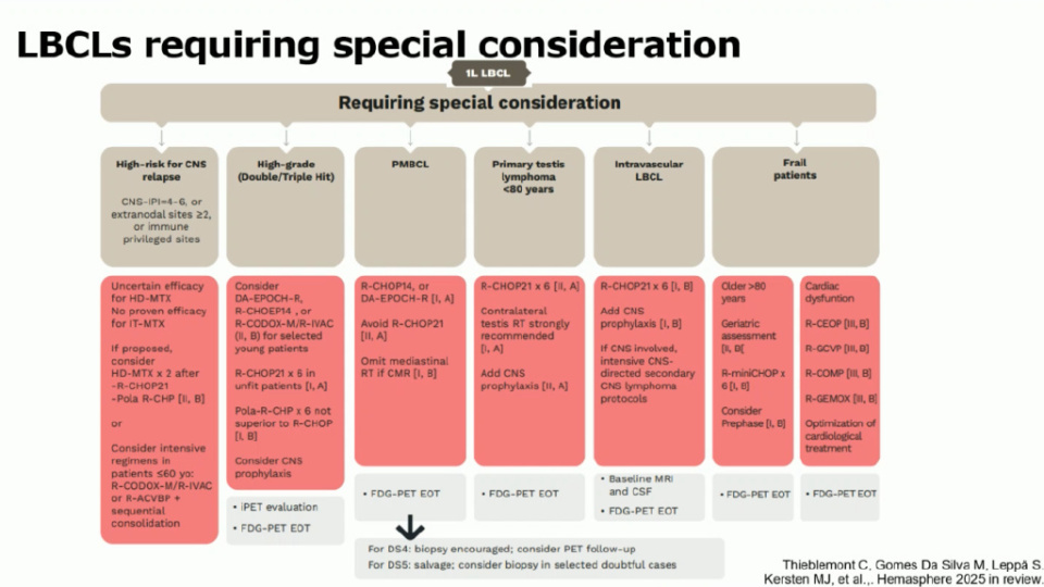 中枢神经系统(CNS)复发高风险:对于CNS-IPI评分为4-6分或特定部位(如睾丸、乳腺、肾上腺等)侵犯的患者,指南建议进行基线颅脑磁共振成像(MRI)和脑脊液检查。Thieblemont教授特别指出:“鞘内注射甲氨蝶呤因缺乏疗效已不再被推荐。大剂量甲氨蝶呤(HD-MTX)的有效性虽存争议,但若要使用,我们建议在全身化疗达完全缓解后给予至少2个周期。”