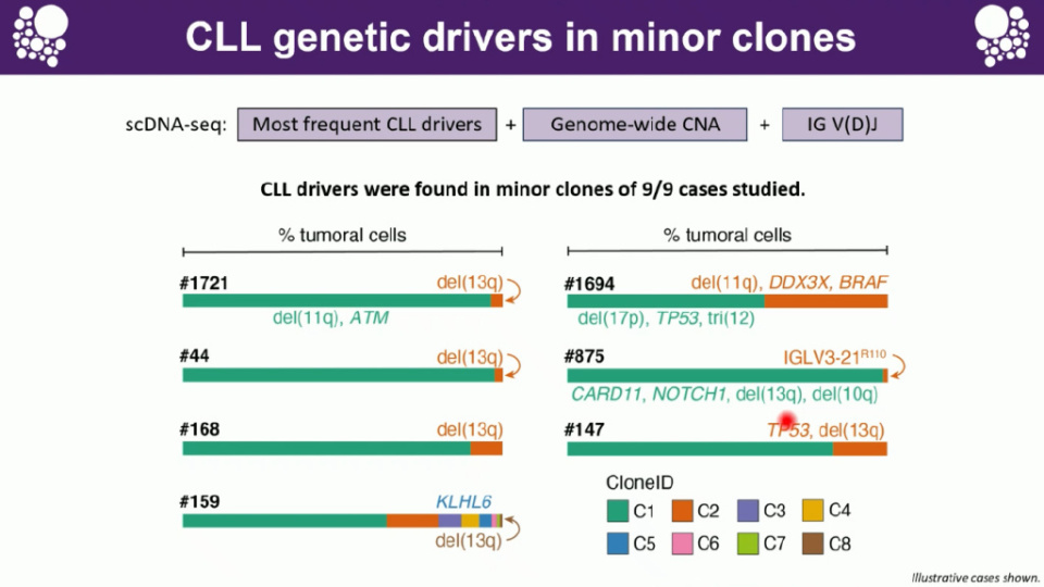 随后,团队通过单细胞DNA测序技术进一步确认,这些微小克隆同样携带CLL的驱动基因突变。研究在所有9个被分析病例的微小克隆中均发现了CLL的驱动基因改变,例如作为CLL早期关键事件的13q缺失,甚至还包括一些与侵袭性疾病相关的TP53突变等。特别是在某些病例中,微小克隆携带了明确的驱动突变,而当时占主导地位的肿瘤克隆却未检测到任何已知的驱动改变。这表明这些微小克隆是真正具有恶性潜能的肿瘤细胞,而非良性旁观者。