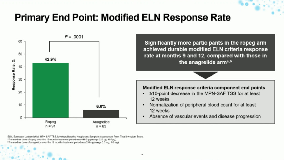 研究结果显示,SURPASS-ET成功达到了其主要终点。在治疗第12个月时,Ropeginterferon组的改良ELN缓解率高达42.9%,显著优于阿那格雷组的6%,差异具有显著统计学意义。