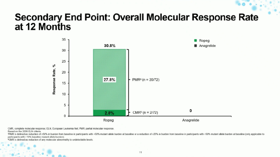 作为一项重要的次要终点,该研究深入评估了分子生物学应答情况,进一步揭示了Ropeginterferon的疾病修饰潜力。在治疗12个月后,Ropeginterferon组有近30%的患者实现了部分分子生物学应答,其中2.8%的患者甚至达到了完全分子学缓解(Complete Molecular Response, CMR)。值得注意的是,阿那格雷组未观察到任何c。