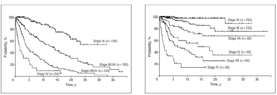 基于诊断时临床分期(IA-IV期)的525例患者生存分析显示,不同分期患者的预后差异显著:T3或T4期患者中约半数死于疾病,而T1期和T2期患者中分别仅2%和15%死于疾病;T1期患者占缓解期存活患者的大多数,T4期患者获得持续临床缓解的可能性最低,78例T4期患者中仅3例(4%)无病存活。早期疾病(IA-IIA期)占MF/SS病例的78%~93%,晚期疾病(≥IIB期)占7%~22%。长期预后数据显示,IIB至IVB期患者中位OS欠佳,充分体现了分期对预后的重要影响。