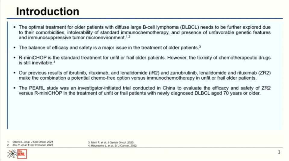 受J-MAR-STAR研究的启发,将布鲁顿酪氨酸激酶(BTK)抑制剂、利妥昔单抗和来那度胺结合的无化疗方案(如IR2或ZR2)被视为为unfit或虚弱老年患者提供潜在的无化疗选择。许彭鹏教授团队开展的PEARL研究便是一项在中国进行的由研究者发起的、多中心、随机、开放标签、对照非劣效性研究,旨在评估ZR2方案对比R-mini-CHOP方案在≥70岁新诊断的unfit或虚弱DLBCL患者中的疗效与安全性。