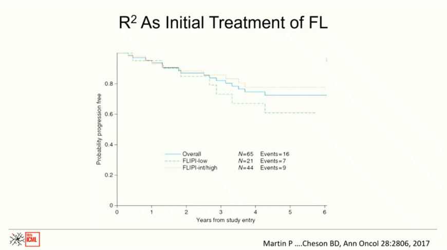 在寻找利妥昔单抗新伙伴的过程中,Cheson教授团队将目光投向了免疫调节剂来那度胺(lenalidomide,商品名Revlimid?),并提出了创新的“R2”(R-squared)方案。尽管最初NCI对该方案的兴趣不高,Cheson教授历经两年半的努力,终于说服NCI批准开展R2一线治疗研究。初期结果非常乐观,但时机稍晚。此后,在MD安德森癌症中心出色地推进了R2方案的研究,尤其是RELEVANCE试验显示,R2方案的疗效与利妥昔单抗联合化疗(R-chemo)相当,但毒性更低。