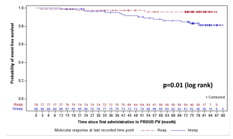 几乎所有真性红细胞增多症(PV)病例的病理基础都是JAK2V617F突变的造血干细胞克隆性扩增。最近的前瞻性证据表明,降低JAK2V617F VAF可能是PV治疗的主要目标,可以改变疾病进程,因为分子反应(MR)与高风险、对羟基脲耐药/不耐受的PV患者无事件生存期(EFS)和总生存期(OS)的延长相关(Harrison等,JCO 2023)。在PROUD-PV/CONTINUATION-PV研究中,对包括任何风险水平的、新诊断的和/或对羟基脲不耐药的早期PV患者进行了EFS和MR的评估。在这里,我们探讨了这些结果之间的关系。