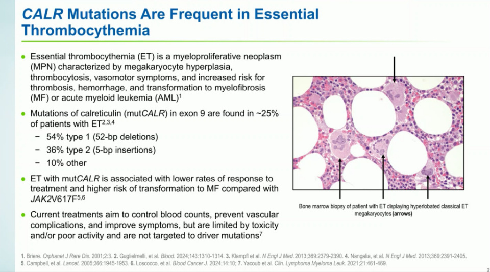 原发性血小板增多症(ET)是一种骨髓增殖性肿瘤(Myeloproliferative Neoplasm, MPN),其临床特征为骨髓中巨核细胞异常增生、血小板计数持续升高,并伴有血管舒缩症状、血栓或出血风险,以及向骨髓纤维化(Myelofibrosis, MF)和急性髓系白血病(Acute Myeloid Leukemia, AML)转化的风险。Mascarenhas教授首先指出,在ET患者中,约25%携带CALR基因突变,其中1型(52bp缺失)和2型突变最为常见。