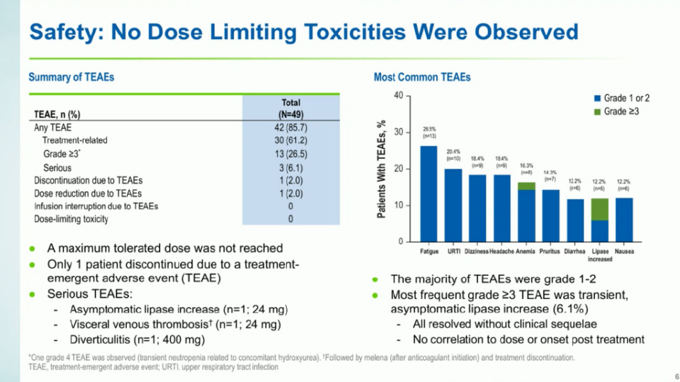 在49名入组患者中,85.7%的患者出现了治疗中出现的不良事件(Treatment-Emergent Adverse Event, TEAE),其中61%被研究者认为与药物相关。3级及以上TEAE的发生率为26%。值得关注的是,研究中观察到一过性的、无临床症状的脂肪酶升高现象,但其发生与剂量无明确关联,且无任何影像学异常,通常在下次给药前即已缓解。Mascarenhas教授表示,尽管其确切机制尚不明确,但并未带来临床风险。整个研究中,仅有1例患者因TEAE进行了剂量调整,无患者因不良事件中断治疗。截至报告时,98%的患者仍在接受治疗,中位暴露时间已达22周,充分证明了该药物的长期用药安全性。