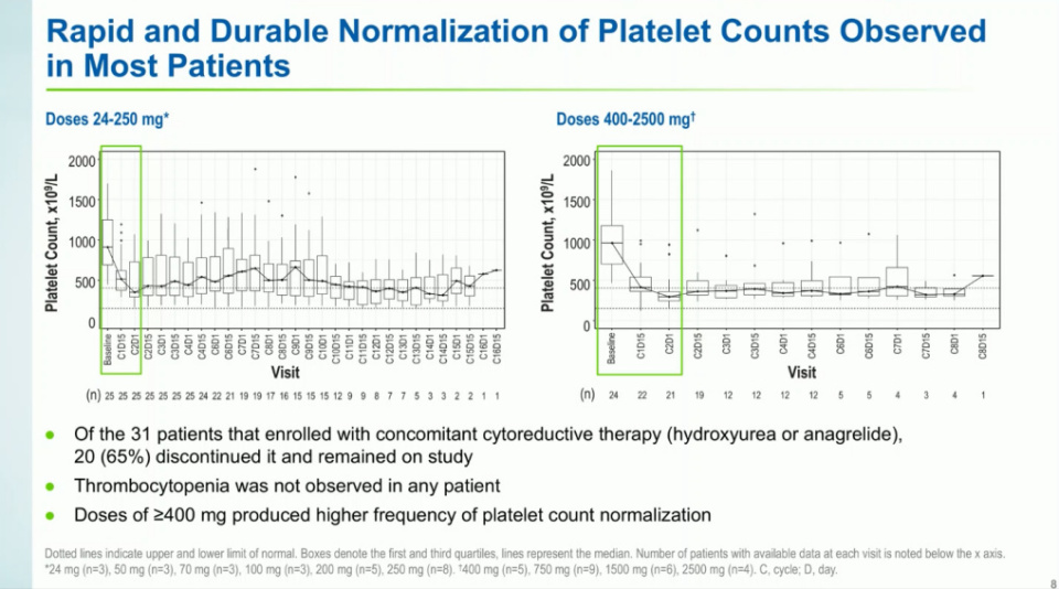 在疗效方面,INCA33989的表现同样令人振奋。数据显示,在接受治疗的第一个周期内,患者的血小板计数即出现快速下降。尤其是在400 mg及更高剂量组,血小板计数能够迅速正常化并维持稳定。一个强有力的证据是,研究中31名联合使用其他细胞减灭药物的患者中,高达65%的患者因血小板得到有效控制而成功停用了原有治疗。