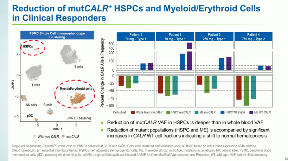 为了进一步探究INCA33989的作用机制,研究团队对7名临床缓解者的外周血样本进行了单细胞RNA测序。结果显示,INCA33989能够精准清除表达突变型CALR的造血干细胞及髓系/红系祖细胞,同时促进了野生型(即非突变)细胞的增殖。这一发现表明,INCA33989不仅是控制血细胞数量,更是在从源头上重塑患者的造血系统,使其向正常造血状态转化。