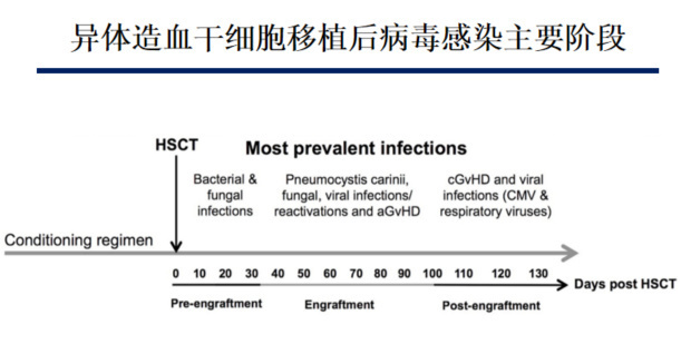 从感染时间维度来看,移植后不同阶段的感染类型存在差异:植入前阶段以细菌和真菌感染为主;植入期易出现肺孢子菌、真菌及病毒感染;植入后阶段则更多见慢性GVHD、病毒激活(如巨细胞病毒、呼吸道病毒)及急性GVHD,上述感染模式可通过移植后天数(Days post HSCT)的时间轴清晰呈现。