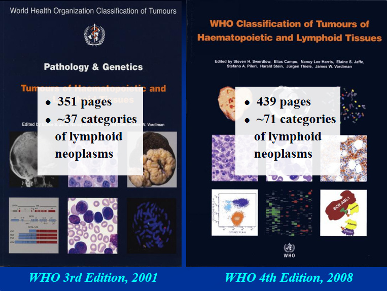 1989年,国际淋巴瘤研究组(ILSG)的成立标志着淋巴瘤分类研究进入新纪元。该组织由Peter Isaacson和Harald Stein等学者倡导建立,汇聚了来自欧美及亚太地区的病理学家,其核心目标在于通过形态及一切可获得的条件建立准确的生物学意义上的淋巴瘤分类。1993/1994年,ILSG公布了修订的欧美淋巴瘤分类(REAL)分类,整合了浆细胞瘤、霍奇金淋巴瘤及髓系淋巴瘤并每五年更新一次。此举促成了2001年WHO淋巴瘤分类的产生,后来又更新至2008年版。2008年版WHO淋巴瘤分类的主要原则是在REAL分类的基础上,综合细胞起源、形态学、免疫表型、遗传特征及临床特征。
