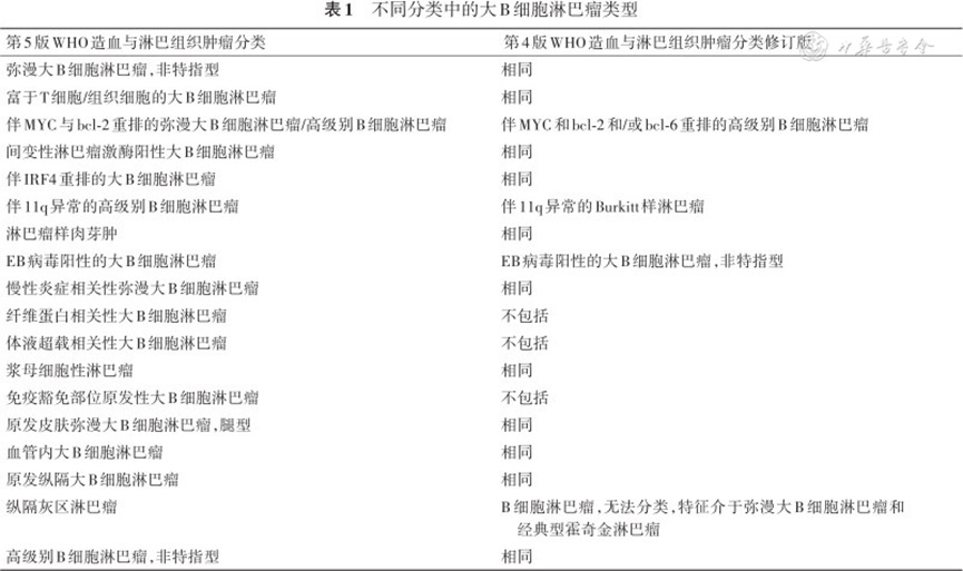 WHO-HAEM5中B细胞肿瘤分类是对第4版WHO修订版分类(WHO-HAEM4R)的系统更新,包括前体B细胞肿瘤和成熟B细胞肿瘤,并新增以B细胞增生为主的瘤样病变。大B细胞淋巴瘤分类大部分与WHO-HAEM4R无差别,但是部分命名本着一致性原则做了更改,从“弥漫大B细胞淋巴瘤”改为“大B细胞淋巴瘤”,承认在一些实体中弥漫生长模式或者不明显/不存在,或者无法评估(如纤维蛋白相关大B细胞淋巴瘤或体液超载相关大B细胞淋巴瘤),部分术语进行了调整或变化(原发免疫豁免部位的大B细胞淋巴瘤),其中6个为更新的或修改的命名。