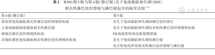 此外,WHO-HAEM4R采用的“免疫缺陷和失调相关性淋巴组织增殖性疾病(IDD-LPD)”,在WHO-HAEM5中更新为“免疫缺陷和失调(IDD)相关性淋巴组织增殖与淋巴瘤”。对于发生于移植后患者的病变,以往所使用的“移植后淋巴组织增殖性疾病(PTLD)”等术语不再推荐使用。2017年版原发性免疫缺陷病(PID)分类首次提出建议使用先天性免疫异常或称免疫出生错误(IEI)这一概念来代替PID,WHO-HAEM5为了与免疫学领域的更新保持一致同样采用“IEI”这一术语取代“PID”。
