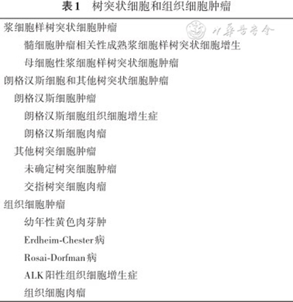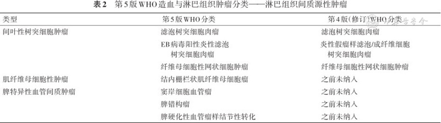 关于组织细胞/树突细胞肿瘤及淋巴组织间质源性肿瘤这两个章节有了较大的变化,更加细化了诊断标准,强调了与治疗和/或预后相关的有效指标。在组织细胞/树突细胞肿瘤中,主要的变化有:(1)将“母细胞性浆细胞样树突细胞肿瘤”纳入该类别;(2)“滤泡树突细胞肉瘤”和“纤维母细胞性网状细胞肿瘤”被移除,归入新章节“淋巴组织间质源性肿瘤”;(3)增加的疾病类型:髓细胞肿瘤相关性成熟浆细胞样树突细胞增生、Rosai-Dorfman病(RDD)和ALK阳性组织细胞增生症。淋巴组织间质源性肿瘤为WHO-HAEM5中新增的类别,包括了部分淋巴结(含结内栅栏状肌纤维母细胞瘤)和脾(含窦岸细胞血管瘤、脾错构瘤和硬化性血管瘤样结节性转化)所特有的间叶性肿瘤,而其他非淋巴结或脾所特有的间叶性肿瘤(如血管瘤、淋巴管肌瘤、Kaposi肉瘤和血管肉瘤)则被纳入第5版WHO软组织和骨肿瘤分类中介绍。