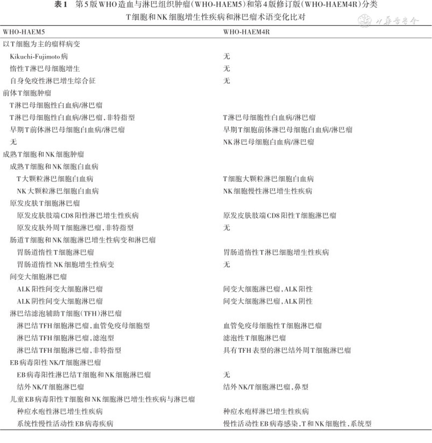 对T细胞和NK细胞增生性疾病和淋巴瘤(T/NK-LPD/LYM)根据研究进展以及疾病的临床病理特征,采用了分级系统进行分类。同时纳入了瘤样病变,引入/删除一些肿瘤,修改某些疾病的名称,并修订一些疾病的诊断标准或亚型,将这组疾病从非克隆性增生到高度侵袭性淋巴瘤进行了重新整合,更体现了T/NK-LPD/LYM的疾病本质,有利于临床应用。其中,对于目前细胞起源明确的T细胞亚群的肿瘤则归为同一类肿瘤家族,如淋巴结滤泡辅助性T细胞(TFH细胞)淋巴瘤,并按照不同的形态学特点进行命名。之前被称为“血管免疫母细胞性T细胞淋巴瘤”“滤泡性T细胞淋巴瘤”和“具有滤泡辅助性T细胞表型的外周T细胞淋巴瘤”的疾病分别被重新命名为“淋巴结滤泡辅助性T细胞淋巴瘤,血管免疫母细胞型”“淋巴结滤泡辅助性T细胞淋巴瘤,滤泡型”和“淋巴结滤泡辅助性T细胞淋巴瘤,非特指型”。