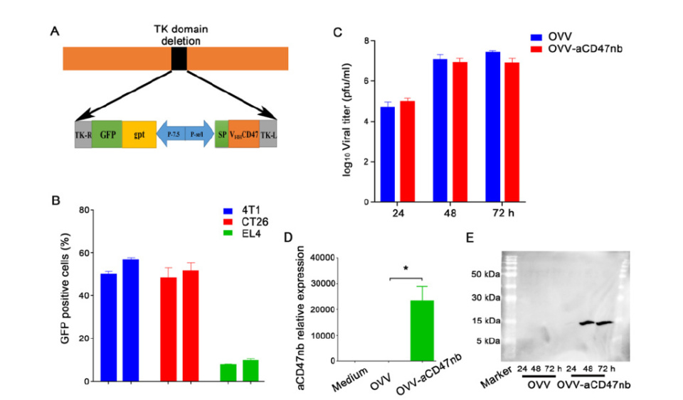 以CD47为靶点的癌症免疫治疗已在多项临床试验中用于治疗晚期肿瘤患者。然而,该疗法常受制于靶向相关副作用、物理屏障以及免疫抑制性肿瘤微环境(TME)。为在降低毒性的同时提升治疗效果,钱文斌教授团队构建了一种能够编码抗CD47纳米抗体的溶瘤痘苗病毒(OVV-αCD47nb),并于2024年发表在J Immunother Cancer。研究表明,病毒感染细胞分泌的αCD47nb可特异性结合CD47,且分泌的αCD47nb与OVV-αCD47nb均能阻断巨噬细胞的“别吃我”信号。