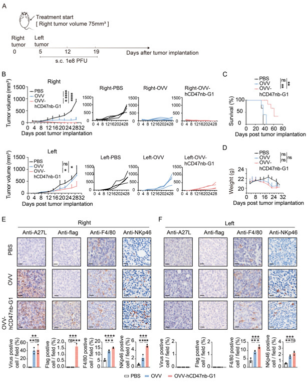 研究显示,经过工程化OVV感染的淋巴瘤细胞分泌的抗CD47纳米抗体通过阻断CD47/SIRPα信号通路,增强了肿瘤的吞噬作用。在植入的皮下淋巴瘤小鼠模型中,与亲本OVV相比,OVV-mCD47nb展现了更优的治疗效果,并显著延长了荷瘤小鼠的生存期,这一效果可能与肿瘤微环境中巨噬细胞、自然杀伤细胞和T细胞的招募和激活相关。此外,研究发现分泌的hCD47nb-G1与CD47的特异性结合增强了巨噬细胞介导的肿瘤细胞吞噬作用,同时避免了对红细胞的损害。与抗CD47抗体Hu5F9相比,OVV-hCD47nb-G1在淋巴瘤模型中展现了更强的抗肿瘤疗效。无论是肿瘤内注射还是腹腔注射,OVV-hCD47nb-G1均能显著抑制肿瘤并延长生存期,这可能通过增强免疫细胞激活、重塑肿瘤微环境来实现。