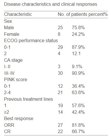 2020年6月至2024年3月期间,从5个中心共纳入33例符合条件的患者。最后一次随访日期为2024年7月,中位随访时间为20个月。在33例可评估患者中,27例(81.8%)有治疗反应,其中22例(66.7%)达到完全缓解(CR)。1年、2年和3年无进展生存率分别为68.9%、58.3%和51.8%,未达到中位无进展生存期。1年、2年和3年总生存率分别为80.9%、72.7%和72.7%,未达到中位总生存期。最常见的治疗相关不良事件(TRAE)为贫血(81.8%)、白细胞减少症(78.8%)、中性粒细胞减少症(75.7%)和血小板减少症(60.6%)。最频繁出现的3级及以上TRAE为中性粒细胞减少症(54.3%)。3级及以上免疫相关不良事件包括甲状腺功能减退症和血糖升高各1例。8例患者因ENKTL进展死亡。