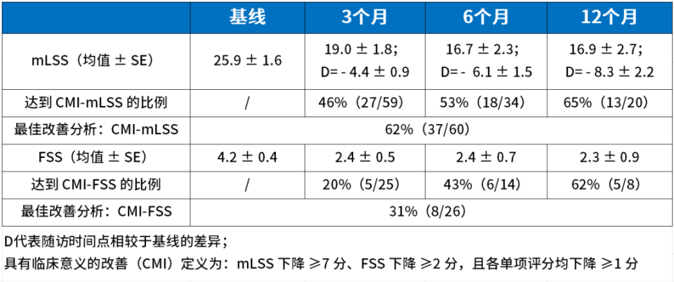 ROCK2抑制剂治疗SR-cGVHD患者疗效显著,尤其是在逆转纤维化方面。患者报告结局(PROs)在cGVHD疗效评估中逐渐受到重视,其中改良Lee症状评分(mLSS)被认为是一种可行且实用的工具,可量化患者的症状负担并反映治疗获益。纤维化相关评分(FSS)是由关节活动受限、吞咽困难和皮肤增厚三个项目评分之和构成,用来反映cGVHD的纤维化特征。一项多中心回顾性真实世界研究通过改良Lee症状评分(mLSS)对87例多线治疗失败的cGVHD患者进行纵向分析,评估ROCK2抑制剂改善患者症状的情况,重点关注mLSS及其FSS的变化。