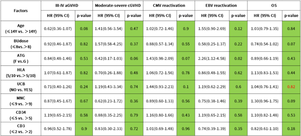 多变量Cox回归分析和Fine-Gray竞争风险模型均未发现III-IV度aGVHD、中重度cGVHD或CMV再活化的独立预测因子。ATG类型(ATLG与rATG)与EBV再活化的风险增加独立相关(HR=2.26;95%CI,1.12–4.58;P=0.02)。脐带血联合输注、HLA不匹配、年龄、BU及细胞剂量(MNC、CD34⁺、CD3⁺)均与移植物抗宿主病、病毒再激活或总生存期无显著关联。但随着BU剂量降低(HR=0.74;P=0.07)和MNC回输计数升高(HR=1.30;P=0.09),我们观察到总生存期(OS)改善的趋势。